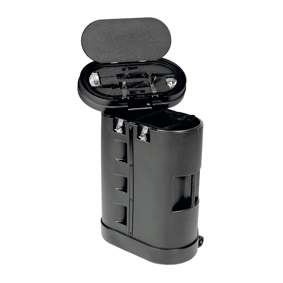Der robuste Transportkoffer aus schwarzem Kuststoff ist zum bequemen Transport mit Rollen unten ausgestattet. Gestell und Grafiken passen problemlos hinein.