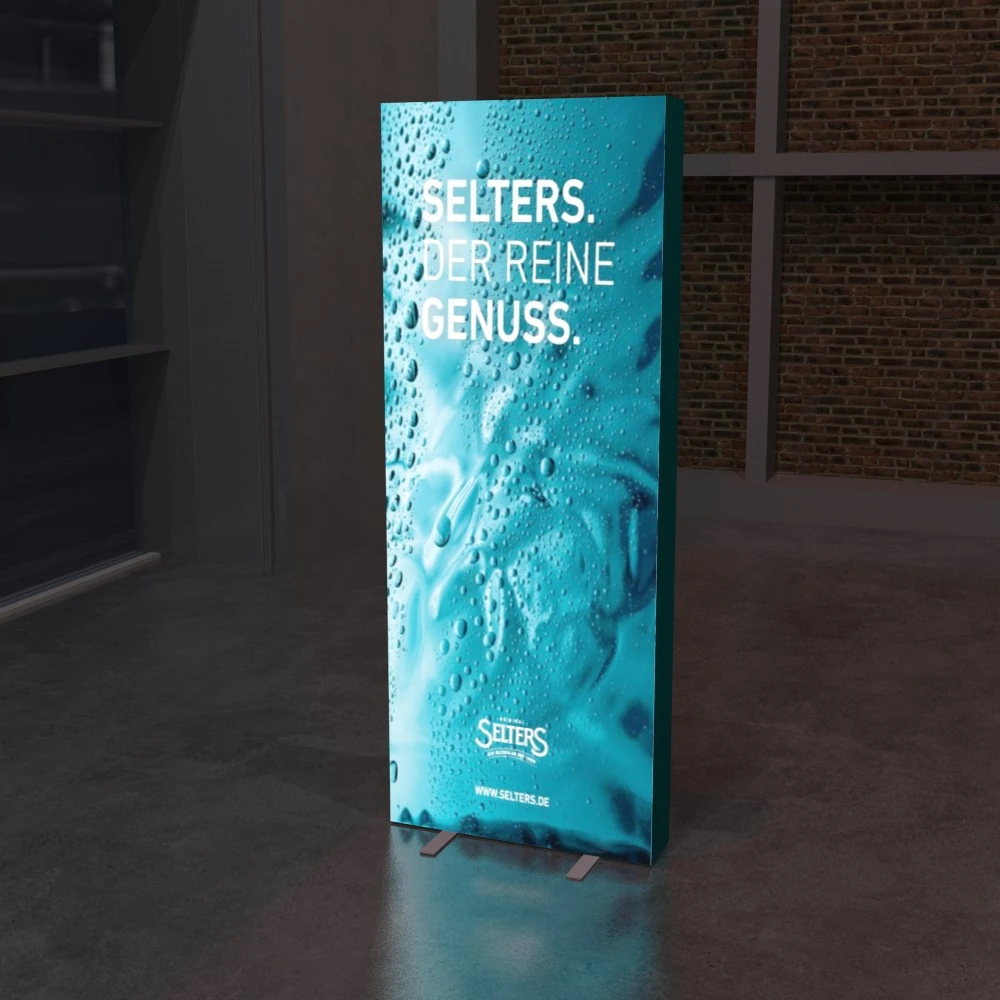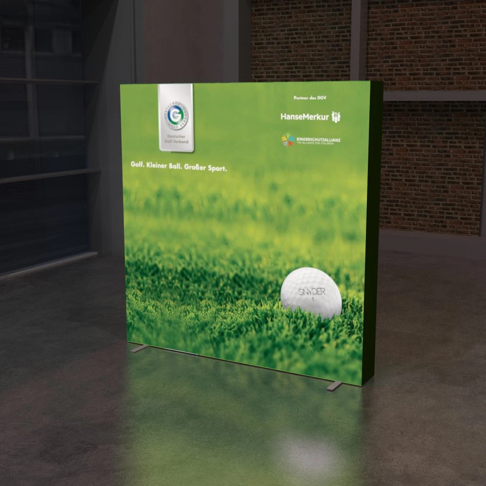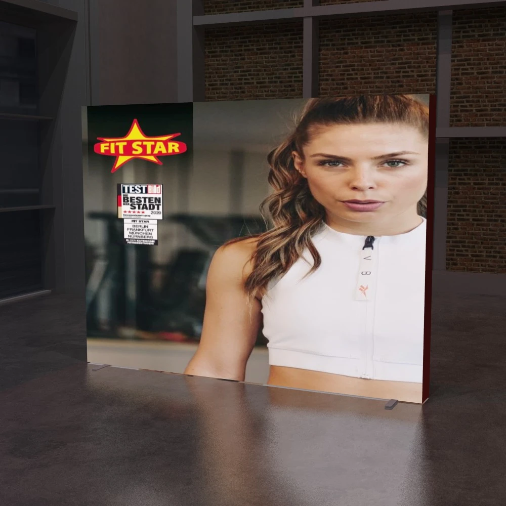 Eine textil hinterleuchtete LED Messewand Stoff ist eine Art von Werbedisplay oder Wand, die aus LED-Modulen und einem Stoffbezug besteht. Die LED-Leuchtrahmen sind hinter dem Stoffbezug angeordnet und leuchten ihn von hinten aus. Dadurch entsteht eine gleichmäßige und brillante Beleuchtung, die den Stoffbezug in leuchtenden Farben erstrahlen lässt.