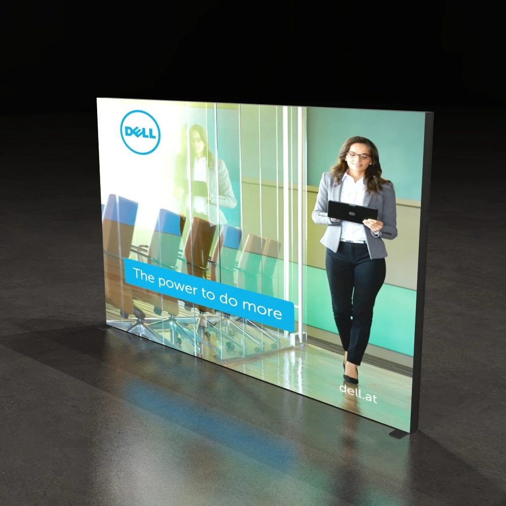 Die in den Rahmen integrierten LED-Leisten sorgen für eine helle, gleichmäßige Ausleuchtung von hinten. Dadurch erscheinen Farben intensiver, Kontraste klarer und Ihr Motiv deutlich präsenter – selbst in hellen Umgebungen wie Messehallen oder Verkaufsräumen.