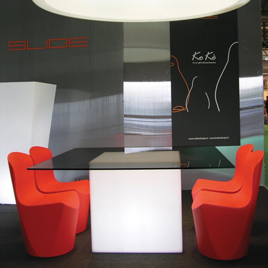 Slide Square LED beleuchteter Tisch mit Glasplatte. Designer Messemöbel und Eventmöbel