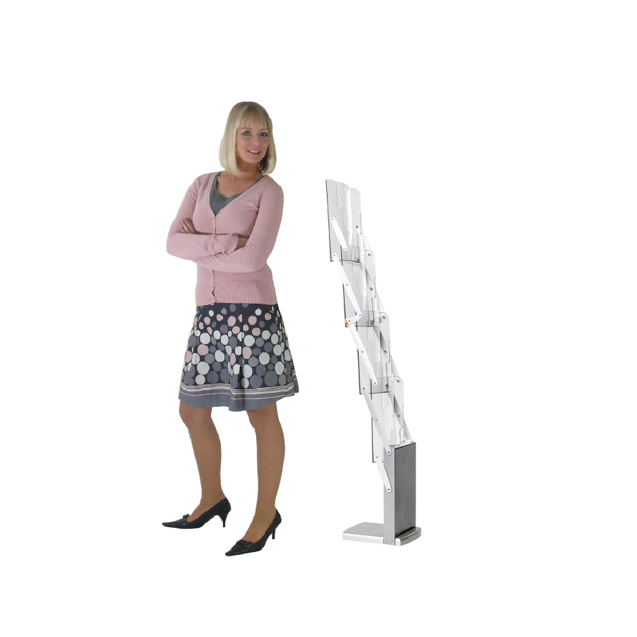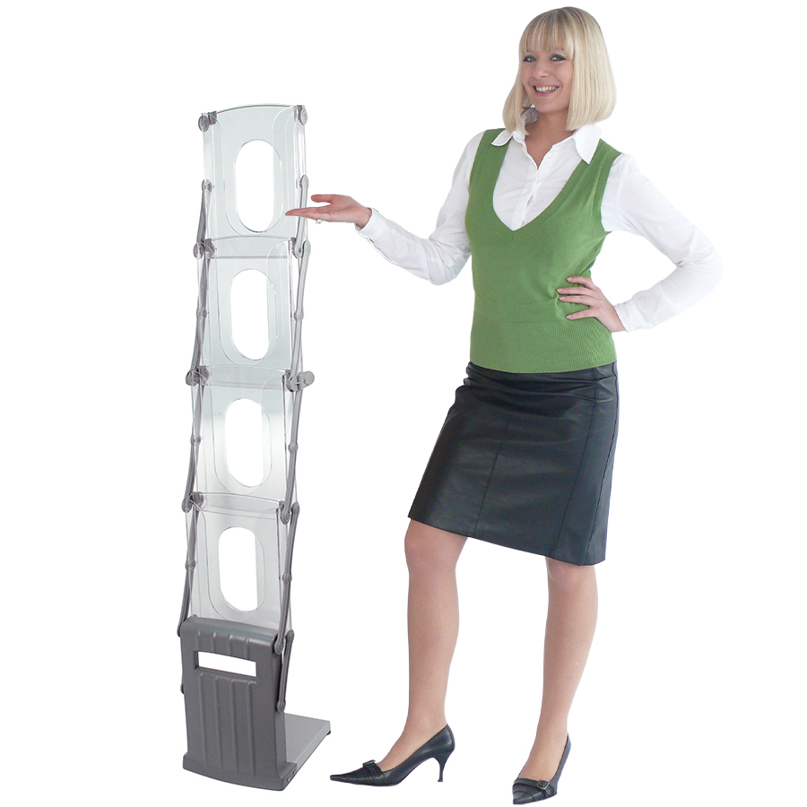 Prospektständer müssen sich ihrem Inhalt anpassen, nicht umgekehrt. Je nach Standgröße führen wir kleine und große Messeständer, die allen gängigen Prospekt- und Flyerformaten gerecht werden. Mancher Prospekthalter bietet ein Tischchen: Darauf lassen sich beispielsweise umfangreiche Kataloginhalte besser erläutern. Dünne Flyer dagegen benötigen einen Prospektständer mit stabilen Halterungen, damit sie nicht ab- oder seitwärts wegrutschen.