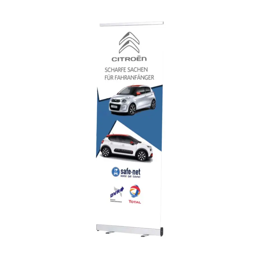 Ob auf Messen, Promotions oder bei saisonalen Aktionen – mit unseren hochwertigen Rollup-Bannern setzen Sie Ihre Marke jederzeit perfekt in Szene. Die Banner sind leicht, mobil, werkzeugfrei aufzustellen und in wenigen Sekunden einsatzbereit.