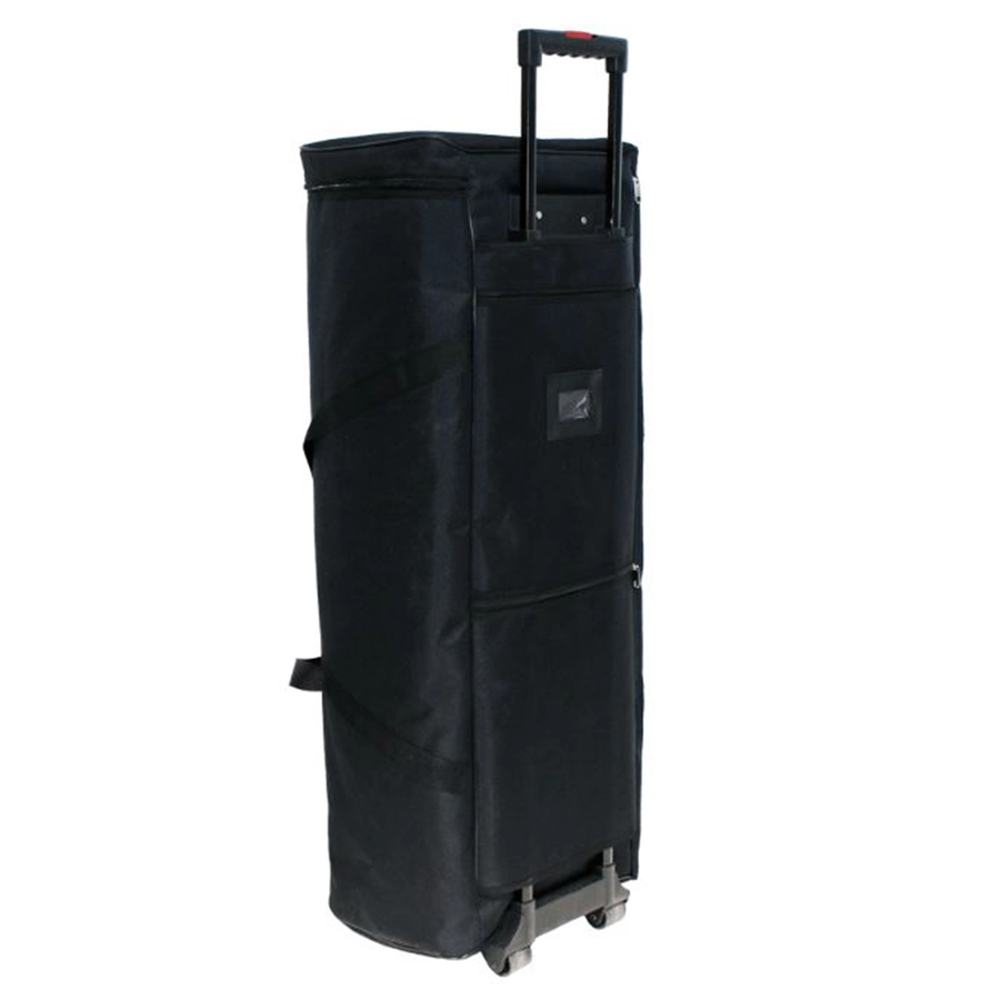 Der robuste Transportkoffer aus schwarzem Kuststoff ist zum bequemen Transport mit Rollen unten ausgestattet. Gestell und Grafiken passen problemlos hinein.