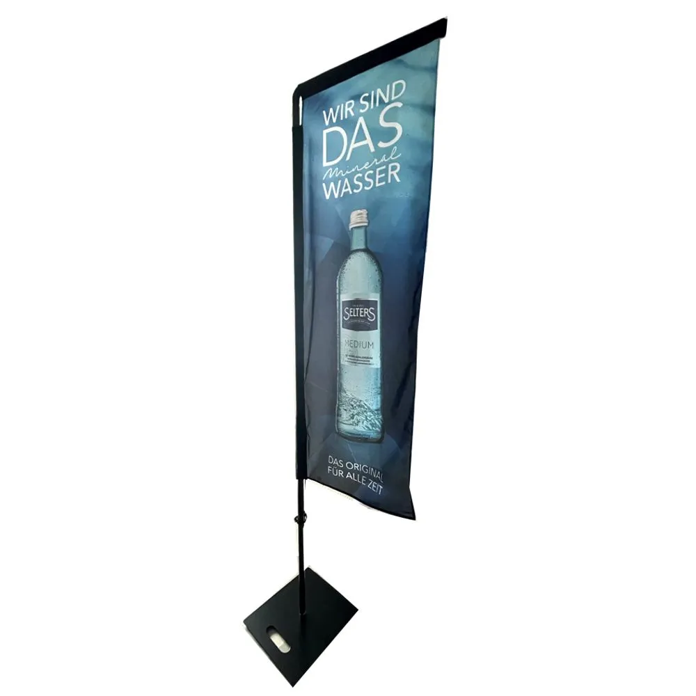 Beachflag Classic Square S, inkl. bedruckter Werbefahne und Transporttasche. Optional mit 6kg schwerer Bodenplatte (40 x 40 cm).
